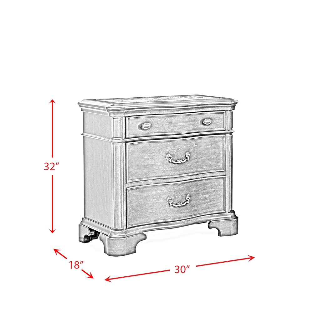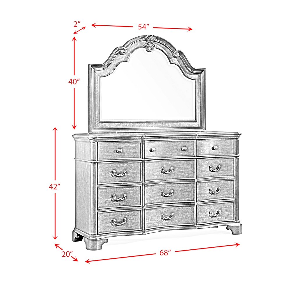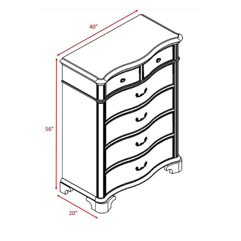 The Tabasco Storage 5PC Bedroom Set is dressed in a dark Cherry finish. Metal nail head accents, intricate moldings, and elegant scrolls in the headboard and footboard all create a refined look you'll love to relax with. It's grand case goods feature curved drawer fronts, felt lined top drawers, and gorgeous antique styled hardware for both elegance and style. ( Set Includes Queen Bed, Dresser and Mirror, Chest and Nightstand )