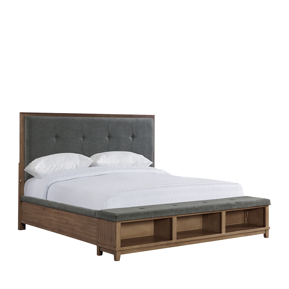 Jolene Storage delivers Set delivers style and functionality. This bedroom set is constructed of solid and manufactured woods. The headboard and footboard features grey tufted upholstery with foam cushioning. The footboard features three open cubbies that can be used to showcase your favorite room décor or blankets. The footboard also has an attached bench that can serve as seating. The case pieces present plenty of storage for daily necessities and USB ports at the nightstand allow you to keep your devices charged. ( Set Includes Jolene Grey Queen Bed, Jolene Grey Dresser with Mirror, Jolene Grey Chest, and Jolene Grey Nightstand with USB )