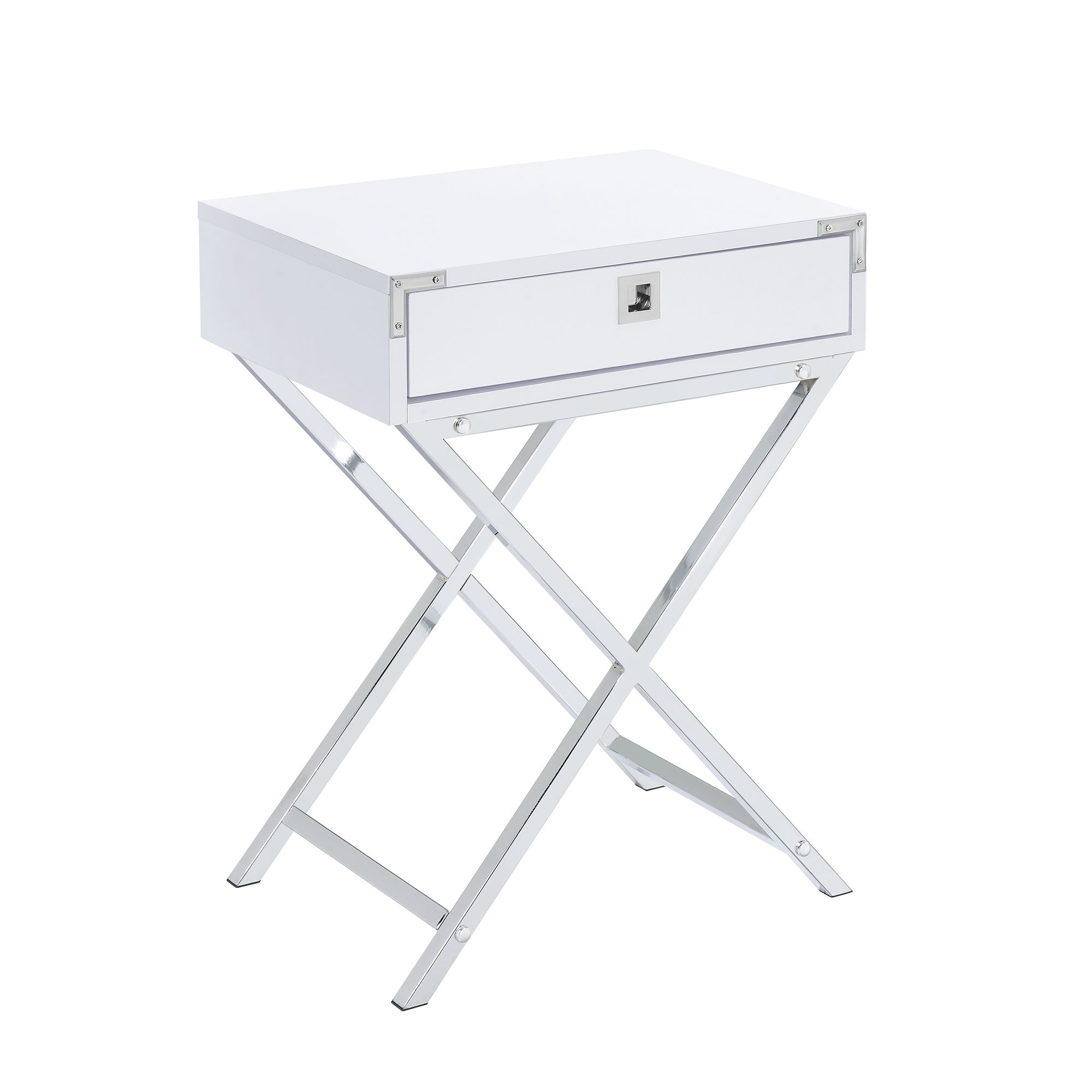 The sophisticated retro glam design of this side/end accent table brings instant style to a room. The rectangular table top is finished in a grey cement-look laminate over top quality MDF material, and a simple built-in square black nickel metal pull to smoothly open and close the spacious storage drawer. The black nickel metal corner accents give it a nostalgic look with a matching black nickel metal x-design base to bring it all together. Contemporary yet classic, this multi-functional accent table can easily be used as a nightstand or as an end table next to a sofa or armchair. The compact size also makes it perfect for smaller spaces.