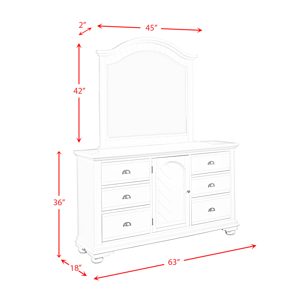 The simple and classic Brook White bedroom set features solid framing of Poplar with a white top coat and a smooth lacquer finish. The cases are constructed using finger joints and corner blocked reinforcements with dust proof bottoms. The drawers are constructed with French Dovetail in the front and English Dovetail in the back with drawer stops for ease of use. Dark coffee finished pulls and knobs complete the look of this set. ( Set Includes Brook White Queen Panel Bed Complete, Brook White Dresser with Mirror, and Brook White Chest )
